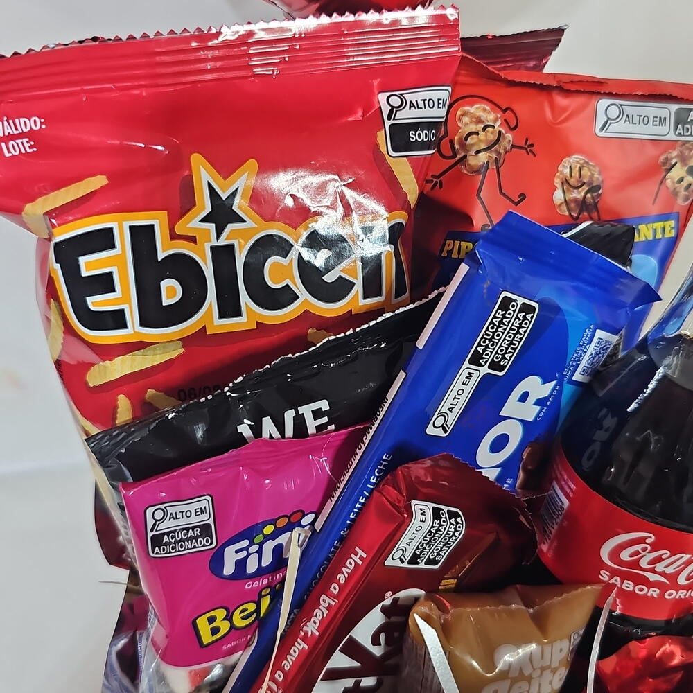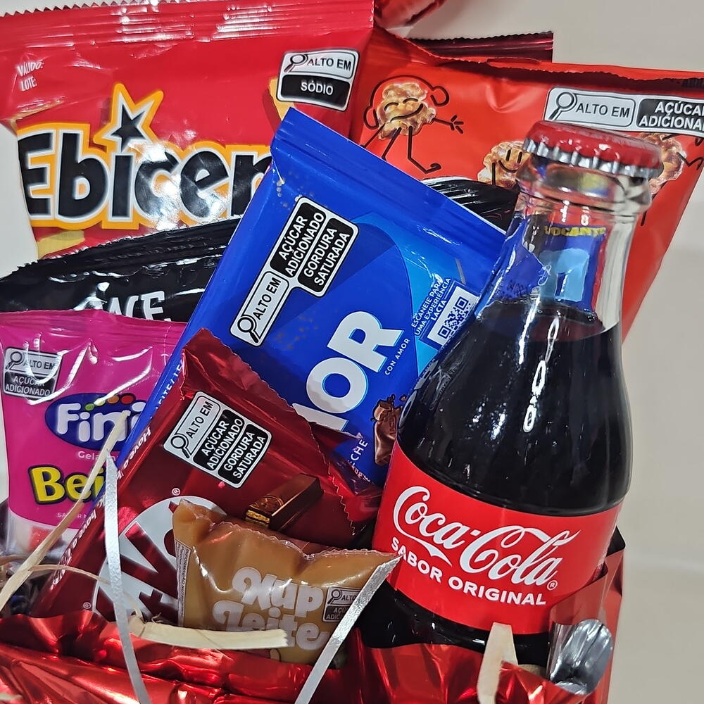 balão metalizado - 1 un. cesta personalizada - 1 un. pacote flavored - 1 un. bisnaga doce de leite - 1 un. pacote ebicen - 1 un. coca cola long neck - 1 un. barra kit kat tradicional - 1 un. pacote p fini beijos - 1 un. barra choco lacta - 1 un. laço bola prateado - 1 un. pacote cookies com m&ms - 1 un.