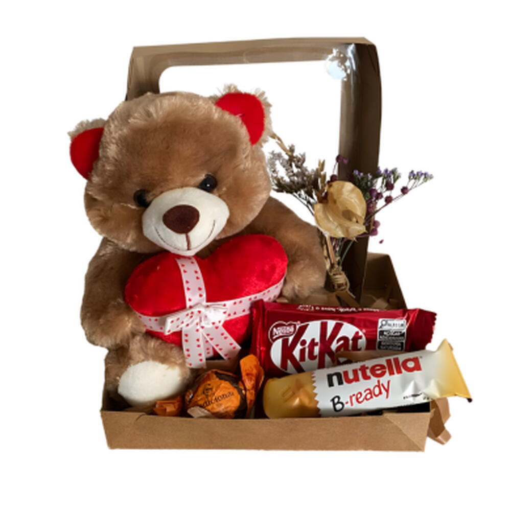 kitkat - 1 un. nutella b-ready - 1 un. trufa cacau show - 1 un. pelúcia 20cm - 1 un. caixa kraft 20x16cm - 1 un. embalagem/ laço - 1 un.