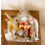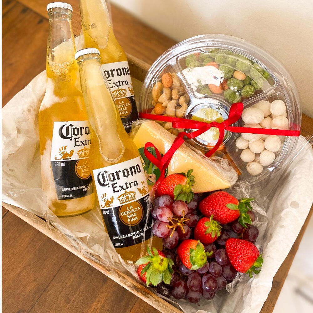 queijo - 1 un. cervejas - 3 un. frutas da estação - 1 un. amendoins - 1 un. embalagem celofane - 1 un. laço em cetim - 1 un. caixa em madeira 25x20 com - 1 un.
