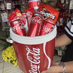 barra de chocolate - 1 un. doritos - 1 un. suflair - 1 un. coca-cola lata - 4 un. pringles original - 1 un. cooler com tampa redondo - 1 un. saco celofane com laço decorativo - 1 un.