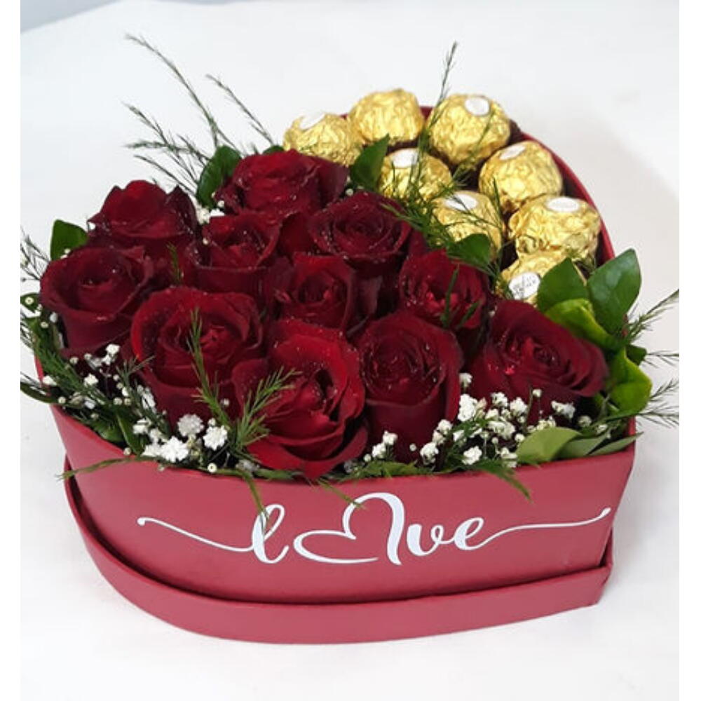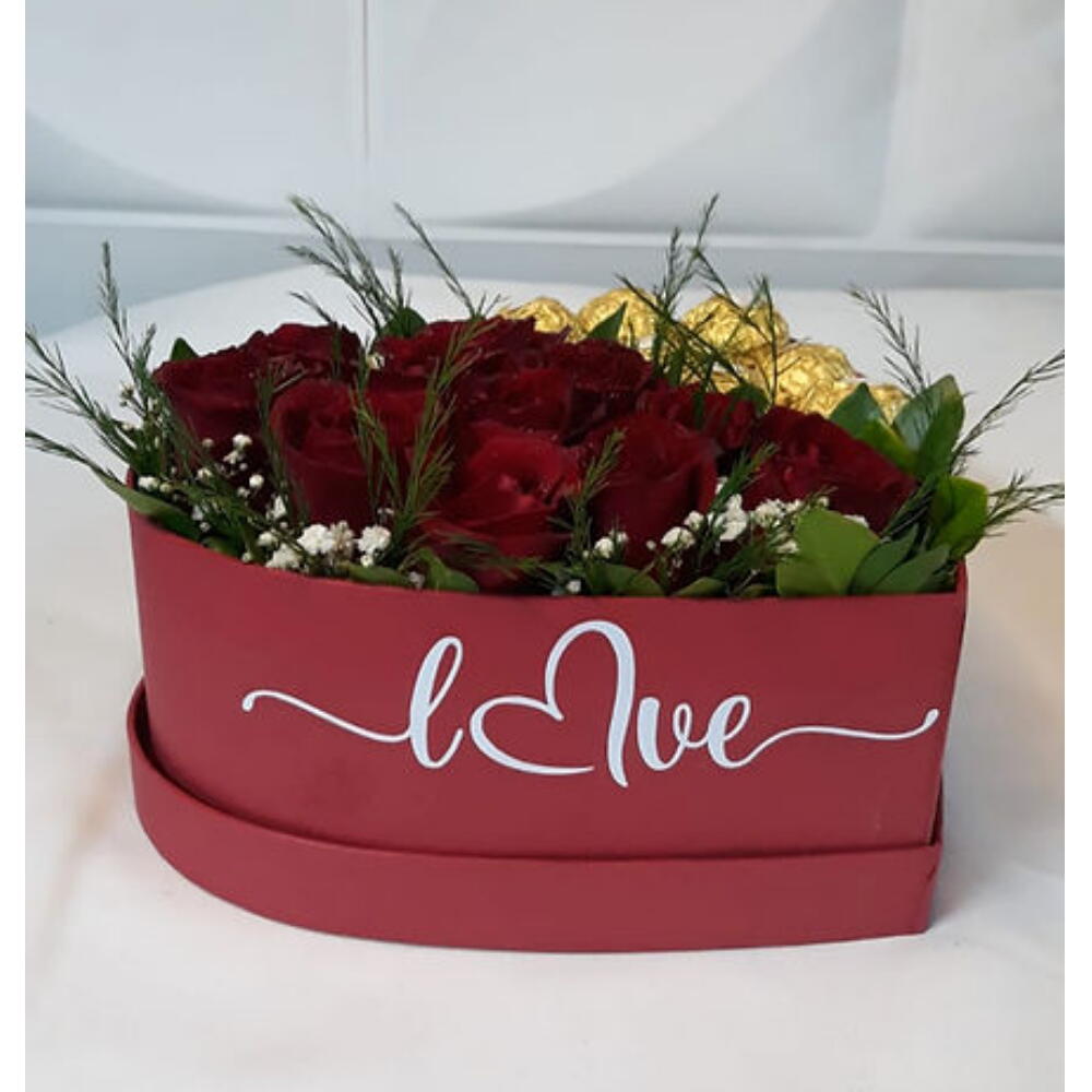 ferrero rocher - 8 un. arranjo de rosa - 1 un. caixa cartonada em formato de coração - 1 un.
