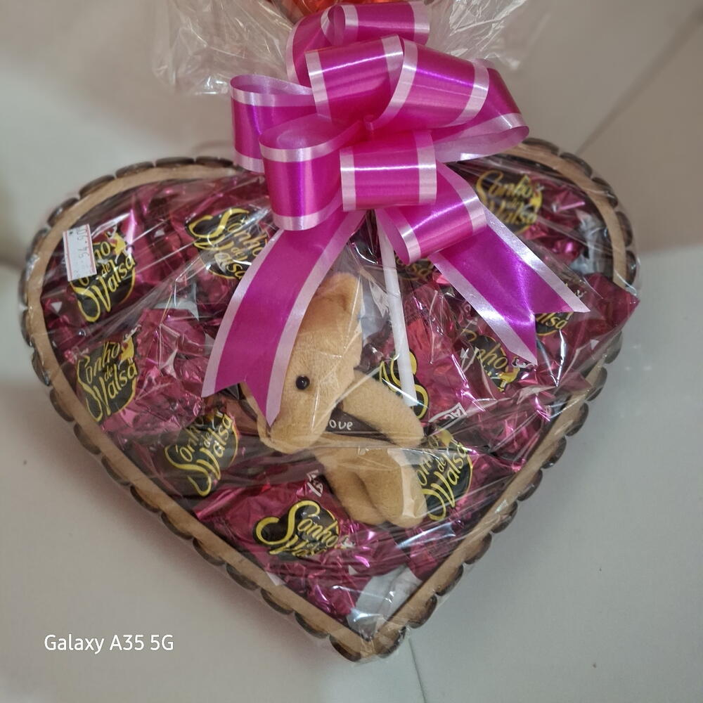 urso de pelúcia - 1 un. bombons sonho de valsa - 15 un. laço - 1 un. coração de madeira - 1 un. embalagem celofane - 1 un.