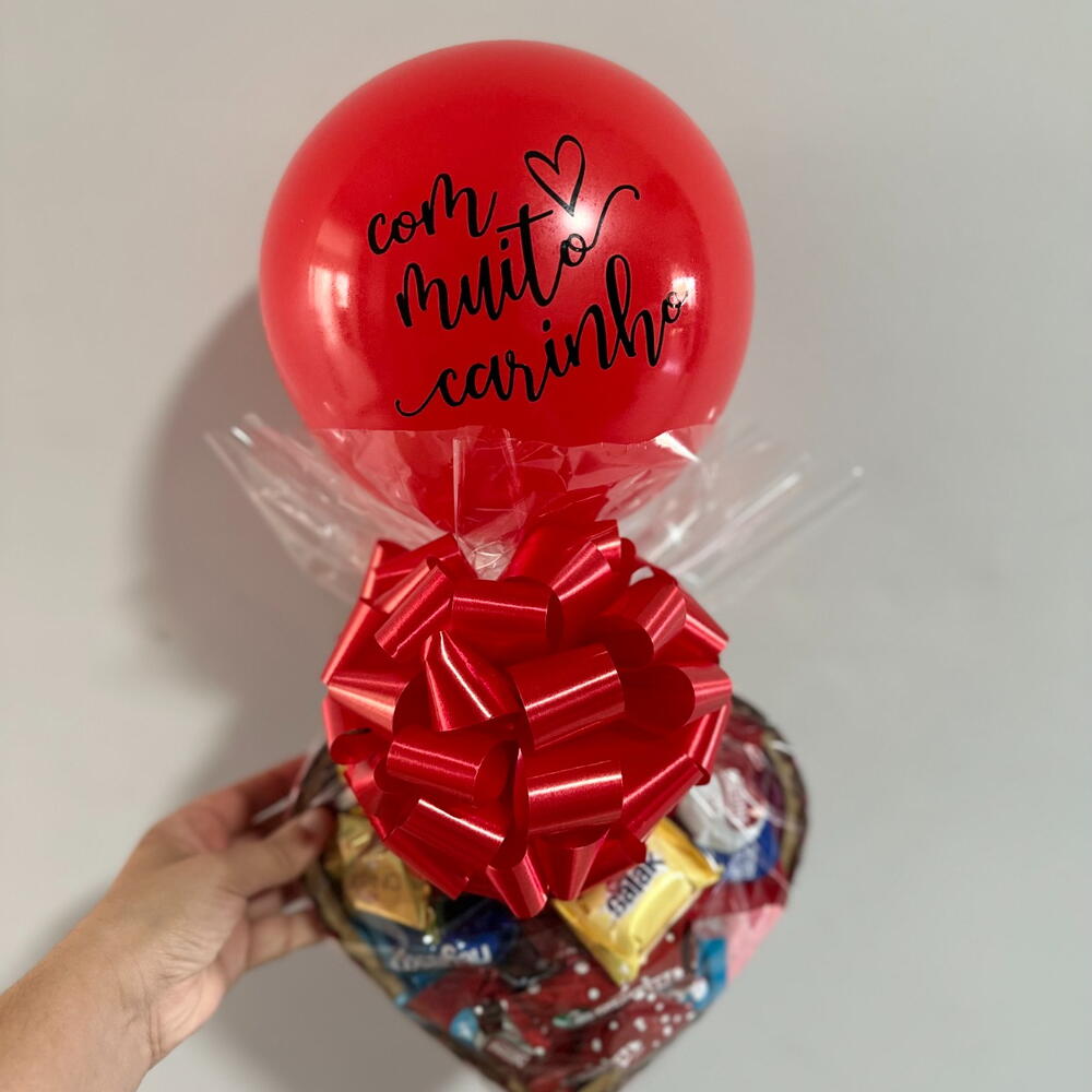 laço - 1 un. balão personalizado - 1 un. embalagem celofane - 1 un. coração com caixa de bombons - 1 un.