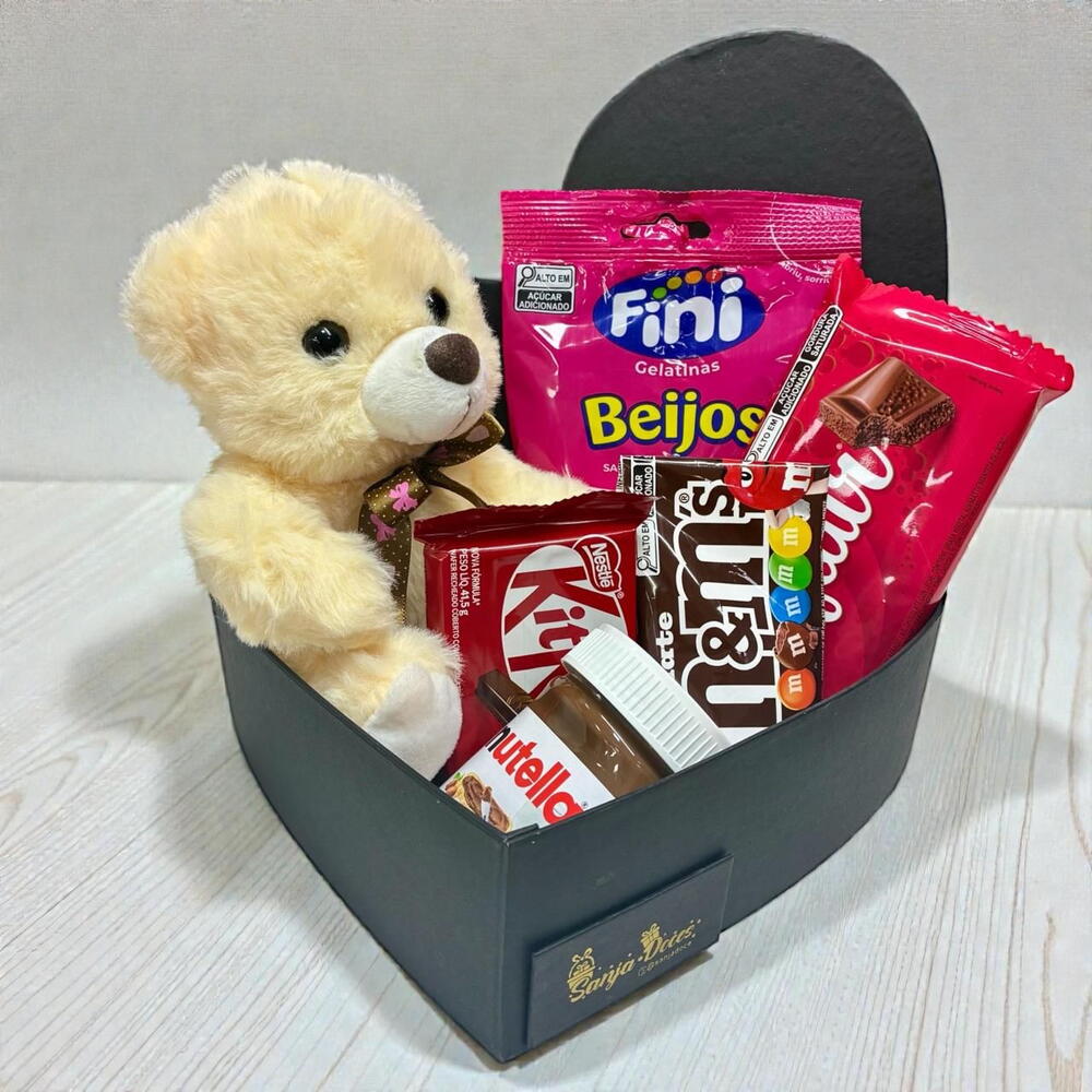 nutella 140g - 1 un. embalagem celofane - 1 un. kit kat - 1 un. box coração médio - 1 un. fini beijos 80g - 1 un. barra de chocolate lacta/nestle 80g - 1 un. mm 35g/40g - 1 un.