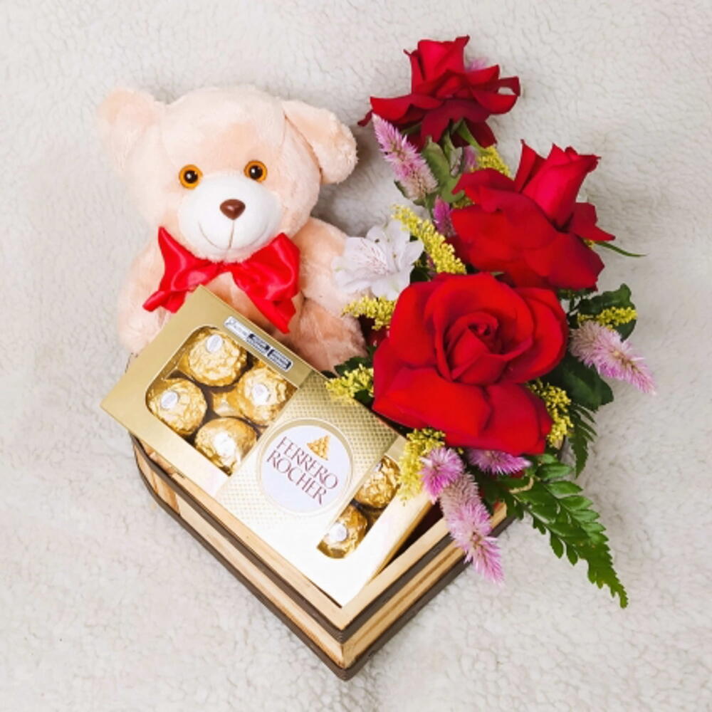 bombons ferrero rocher - 8 un. arranjo com 3 rosa vermelhas - 1 un. caixa madeira - 1 un. pelúcia ursinho - 1 un.