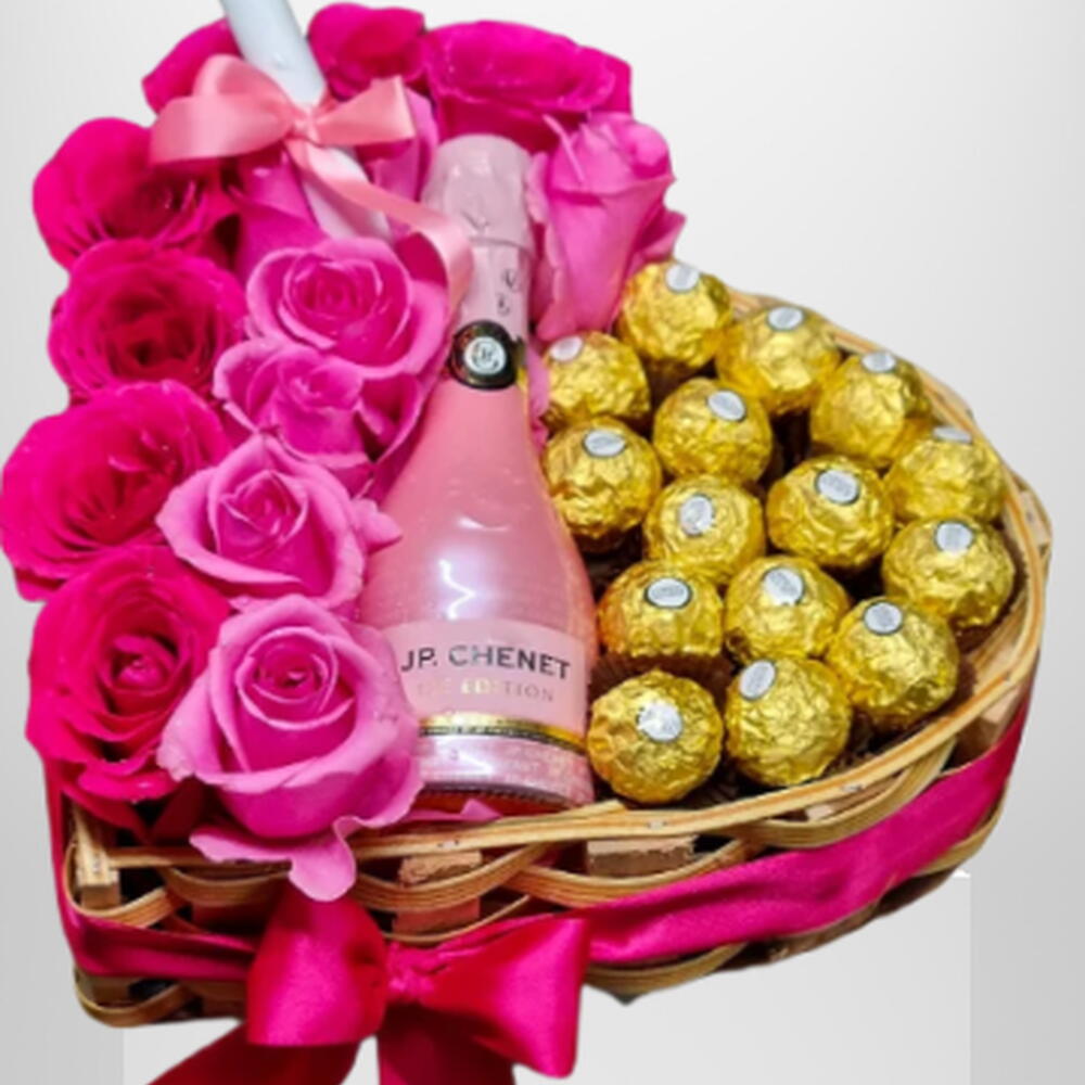 Um arranjo encantador em formato de coração, combinando rosas deslumbrantes e chocolates deliciosos. Perfeito para expressar amor, carinho e admiração de forma única e especial. Um presente sofisticado que torna qualquer ocasião inesquecível.