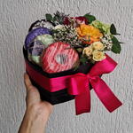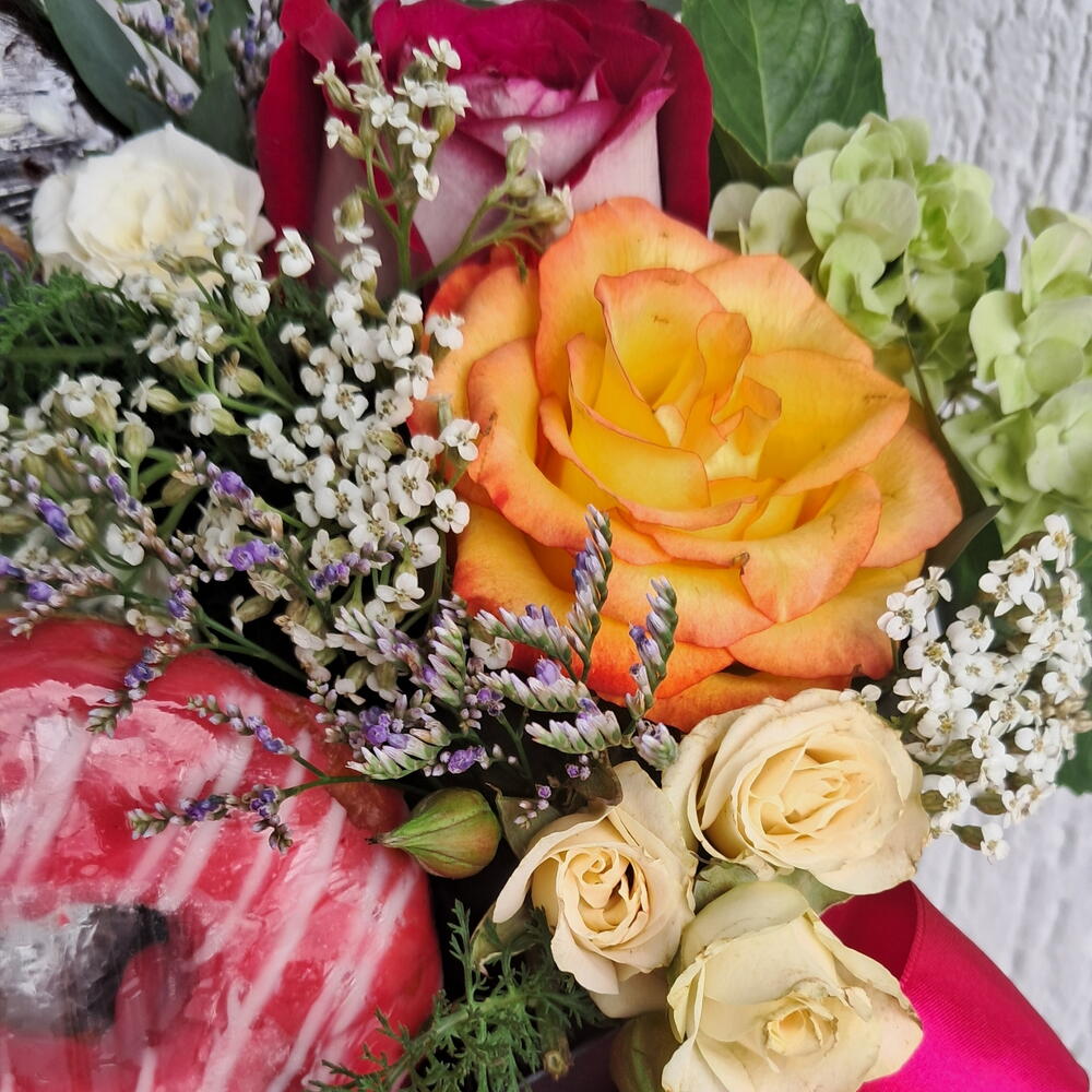 4 Dunuts frescos sabores sortidos Arranjo de flores naturais com 2 rosas e flores mistas Caixa box cartonada coração Laço e saco celofane para embrulho.