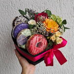 cesta coração - 1 un. donuts - 4 un. laço cetim - 1 un. cesta box com laço - 1 un. arranjo de flores naturais; - 1 un.