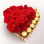 Este buquê é a personificação do amor e do cuidado. Composto por 15 belas rosas vermelhas, simbolizando paixão profunda, é complementado por 9 deliciosas unidades de Ferrero Rocher, que trarão um doce guia para o coração da pessoa amada. Tudo envolvido em uma encantadora caixa de madeira em formato de coração com 20 cm de largura, adicionando um toque especial de intimidade e exclusividade a este presente. Um presente perfeito para aquela pessoa especial em sua vida.