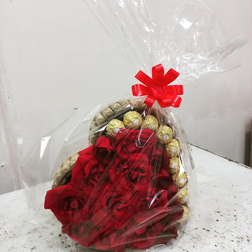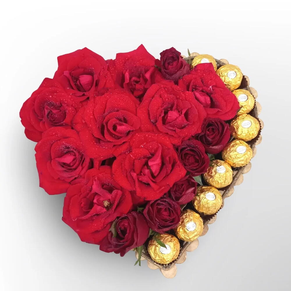 Este buquê é a personificação do amor e do cuidado. Composto por 15 belas rosas vermelhas, simbolizando paixão profunda, é complementado por 9 deliciosas unidades de Ferrero Rocher, que trarão um doce guia para o coração da pessoa amada. Tudo envolvido em uma encantadora caixa de madeira em formato de coração com 20 cm de largura, adicionando um toque especial de intimidade e exclusividade a este presente. Um presente perfeito para aquela pessoa especial em sua vida.