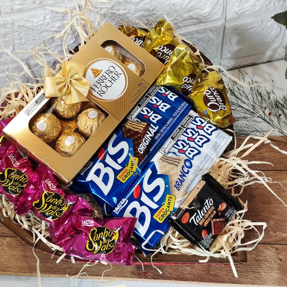 Coração pede Bis, é um lindo presente pra adoçar e celebrar dias felizes. Um coração de madeira rústica cheio de delícias. Contém: 01 Cx.Ferrero Rocher c/8 uni. 01 Cx.Bis chocolate preto 01 Cx.Bis de chocolate branco 04 Bombons Sonho de Valsa 04 Bombons Ouro Branco 01 Talento mini castanhas Muita, mas muita delícia em um só lugar!
