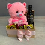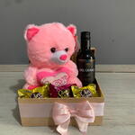 embalagem para presente - 1 un. bombom sortidos - 3 un. vinho suave 250ml - 1 un. urso de pelúcia (17cm aprox) - 1 un.
