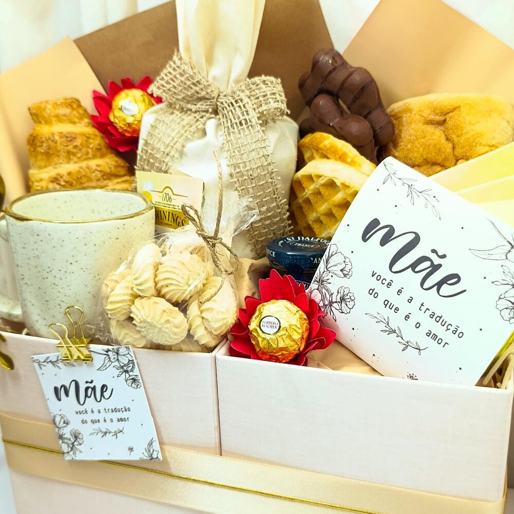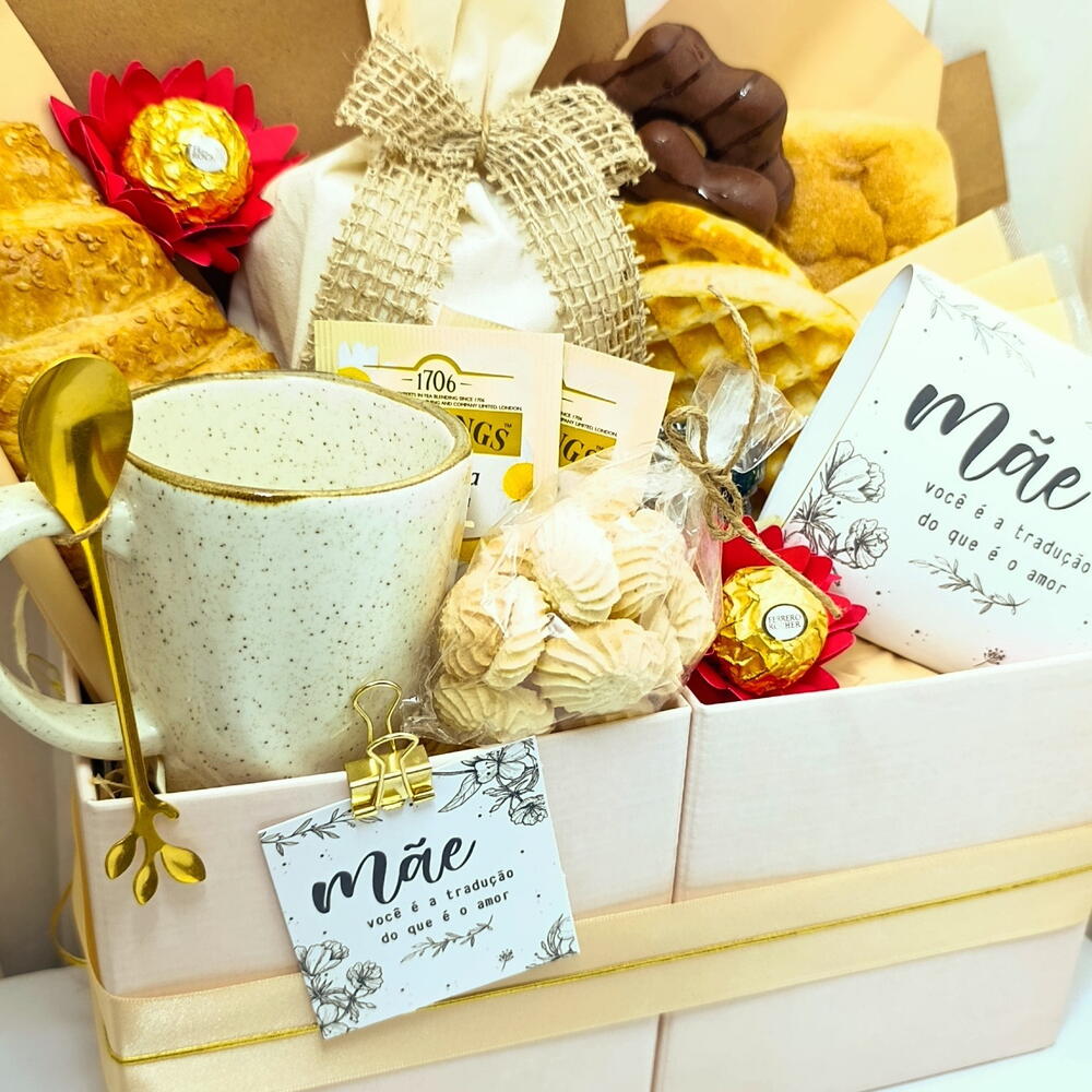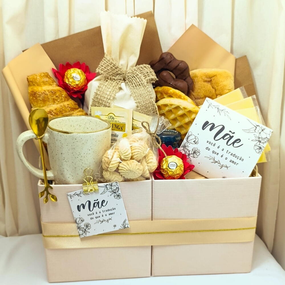 DESCRIÇÃO: Um presente delicado e cheio de amor para tornar o Dia das Mães ainda mais especial. Essa cesta de café da manhã combina sabores irresistíveis com uma apresentação elegante, perfeita para demonstrar todo o carinho por quem sempre cuidou de você. COMPOSIÇÃO: Croissant recheado (1un) Pão ciabatta (1un) Waffle (2un) Biscoitos amanteigados (1un) Pão de mel (2un) Queijo fatiado (3un) Mini geleia (1un) Café 250g (1un) Cappuccino Santa Mônica sachê (2un) Chá Twinnings sachê (2un) Bombom Ferrero Rocher (2un) Caneca de porcelana (1un) Colher de chá dourada (1un) Saquinho de pães em tecido (1un) Cartão especial Mãe (1un) Caixa presenteável com laço e acabamento premium