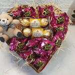 Linda cesta com chocolates em madeira no formato de coração decorada e recheada de delícias: Contém: 13 Bombons Sonho de Valsa 2 Trios de Ferrero Rocher. Um presente fofo, marcante e mais do nunca delicioso.