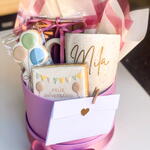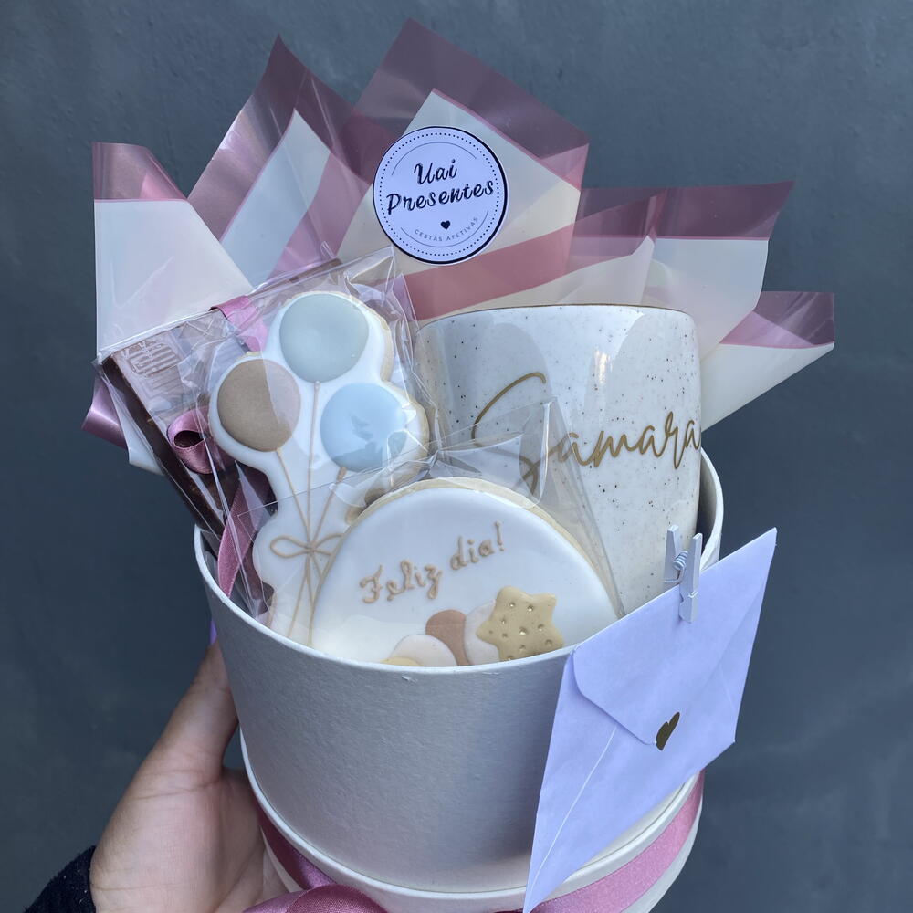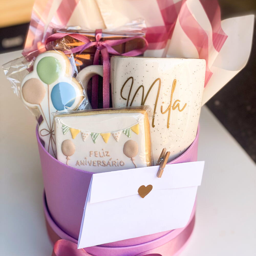 cartão personalizado - 1 un. caneca personalizada - 1 un. biscoito amanteigado decorado - 2 un. caixa cartonada pp - 1 un. barra chocolate castanha - 1 un.