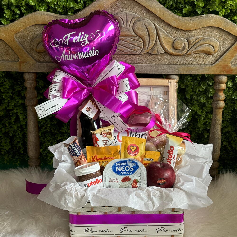 pão de mel bauducco - 1 un. bisnaguinhas - 1 un. nutella 140 g - 1 un. maçã importada - 1 un. iogurte grego nestle - 1 un. kinder bueno - 1 un. nutella b ready - 1 un. cappuccino 3 corações 20 g - 1 un. suco garibaldi 500ml - 1 un. laço artesanal - 1 un. cesta de vime com embalagem decorativa - 1 un. equilibri elma chips - 1 un. bolinho duplo chocolate 40g bauducco - 1 un. nutry - 1 un. queijo e presunto mdf taboa - 1 un.