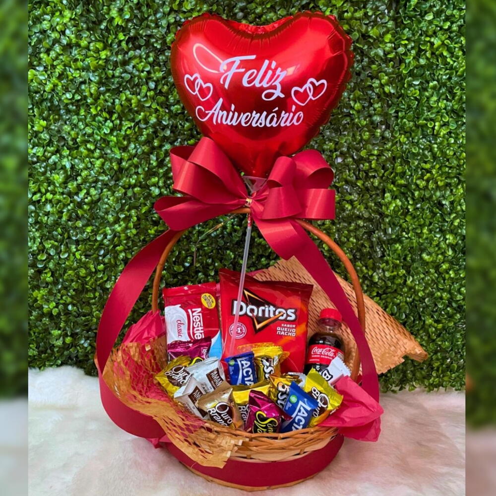 embalagem - 1 un. cesta - 1 un. balão - 1 un. bombons sortidos - 15 un. balão coração - 1 un. mini coquinha em garrafinha - 1 un. pacote de doritos (32g) - 1 un. deliciosa barra de chocolate estilo netflix - 1 un.