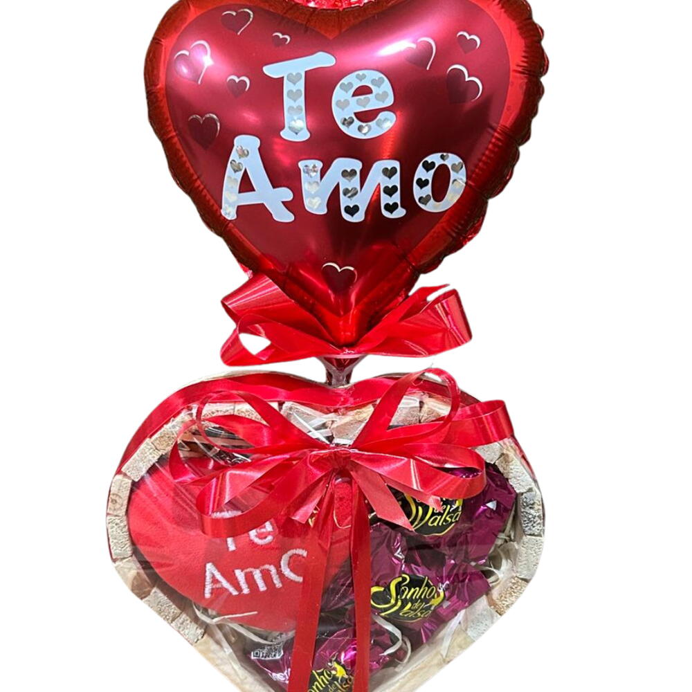 Coração recheado com chocolates e pelúcia delicada, finalizado com laço vermelho. Balão “Te Amo” para declarar sentimentos de forma inesquecível. Perfeito para surpreender e transformar qualquer dia em uma data especial.