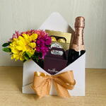 mini chandon - 1 un. cartão de felicitações - 1 un. embalagem envelope - 1 un. mini arranjo de flores do campo - 1 un. caixa de chocolates italiano ferrero rocher (8 unidades) - 1 un. par de brincos rommanel (banhado a ouro 18k com pedras) - 1 un.