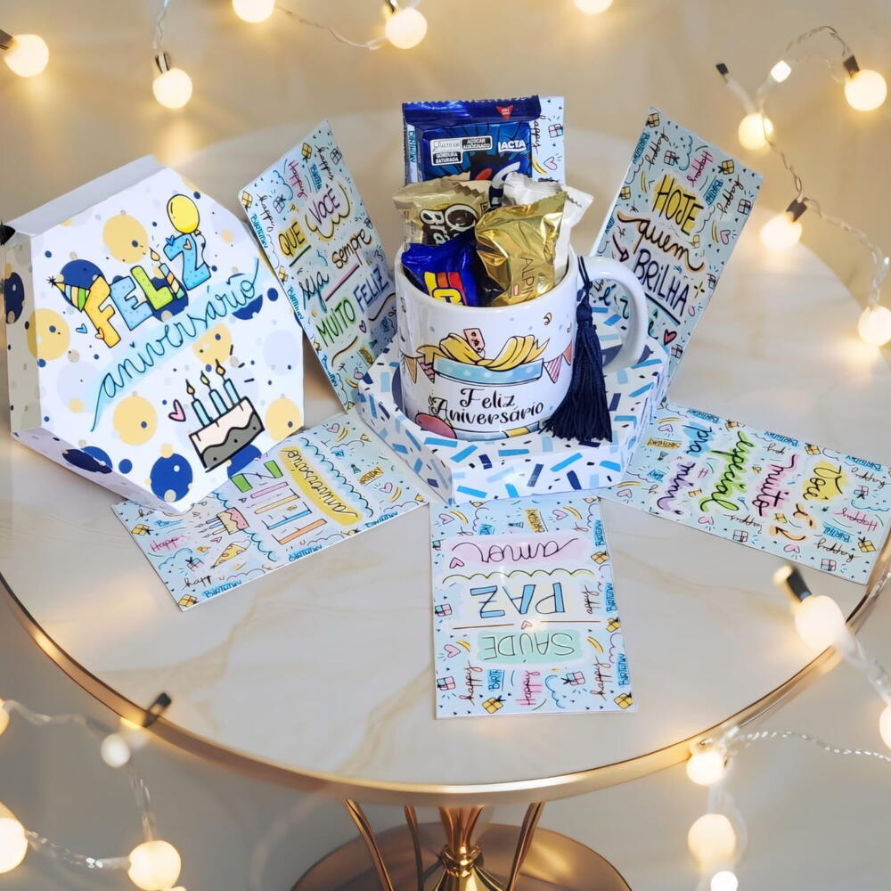 Surpreenda com nossa Caneca na Caixa Explosão! Mais do que apenas uma caneca, é uma explosão de estilo e sentimentos. Caixa Surpreendente: Embalada em uma caixa especialmente projetada para criar um momento mágico. A abertura é uma revelação de alegria. Adornada com mensagens de aniversário, é o presente perfeito para essa data que é tão especial. Momentos Especiais em Cada Gole: Seja para começar o Dia com energia ou relaxar à noite, cada momento com nossa Caneca é uma celebração. Presenteie com Emoção: É o presente perfeito para celebrar esse Dia tão especial. Itens na Caixa Explosão Feliz Aniversário Azul: 1 Caneca Personalizada + 1 Bis 45g + 4 Bombons Sortidos (Nestlé e Lacta). Embalada com saco celofane decorado e lindo laço.