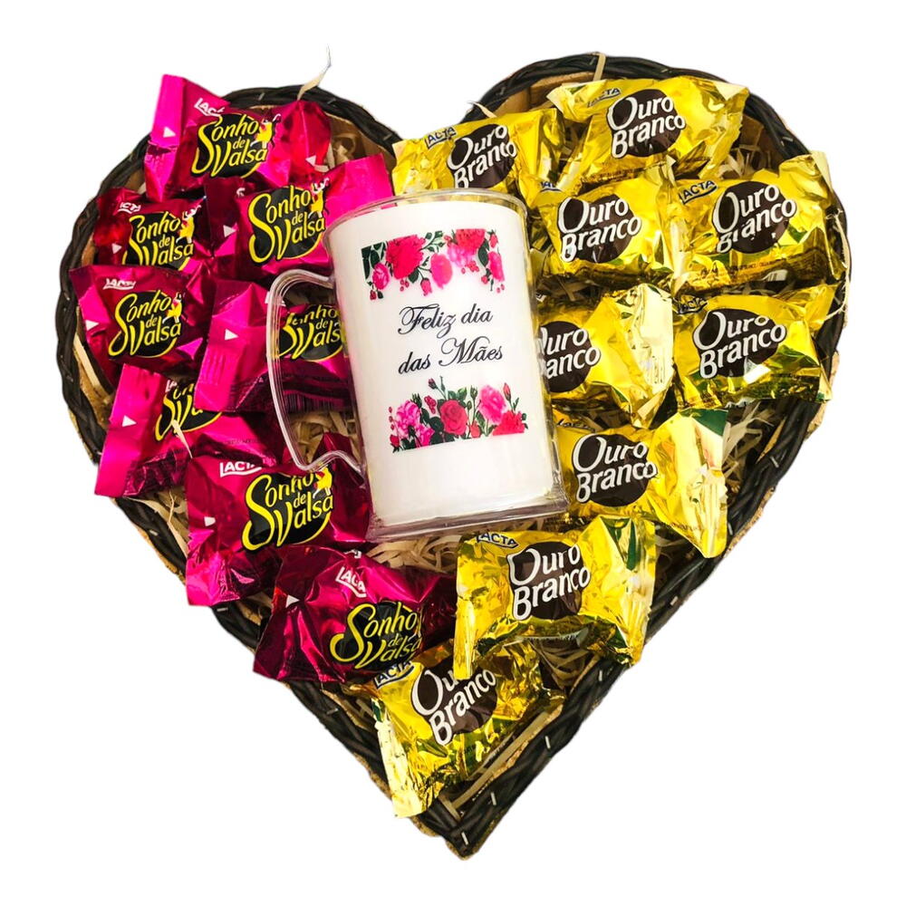 bombom sonho de valsa - 8 un. bombom ouro branco - 9 un. coração de madeira - 1 un. caneca frase feliz dia das mães) - 1 un.