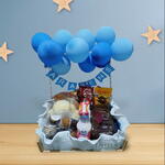kit kat - 1 un. iorgute - 1 un. suco - 1 un. laço - 1 un. pão de mel - 1 un. cookies - 60 gr. salgados - 3 un. nescau - 1 un. embalagem celofane - 1 un. docinhos - 8 un. itens decorativos - 2 un. mini bolo com vela - 1 un. pães delícia - 6 un. bandeja em mdf decorada com balões - 1 un.
