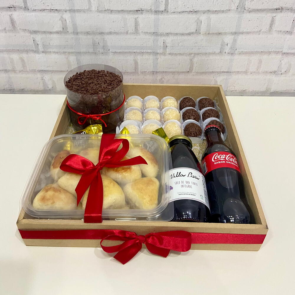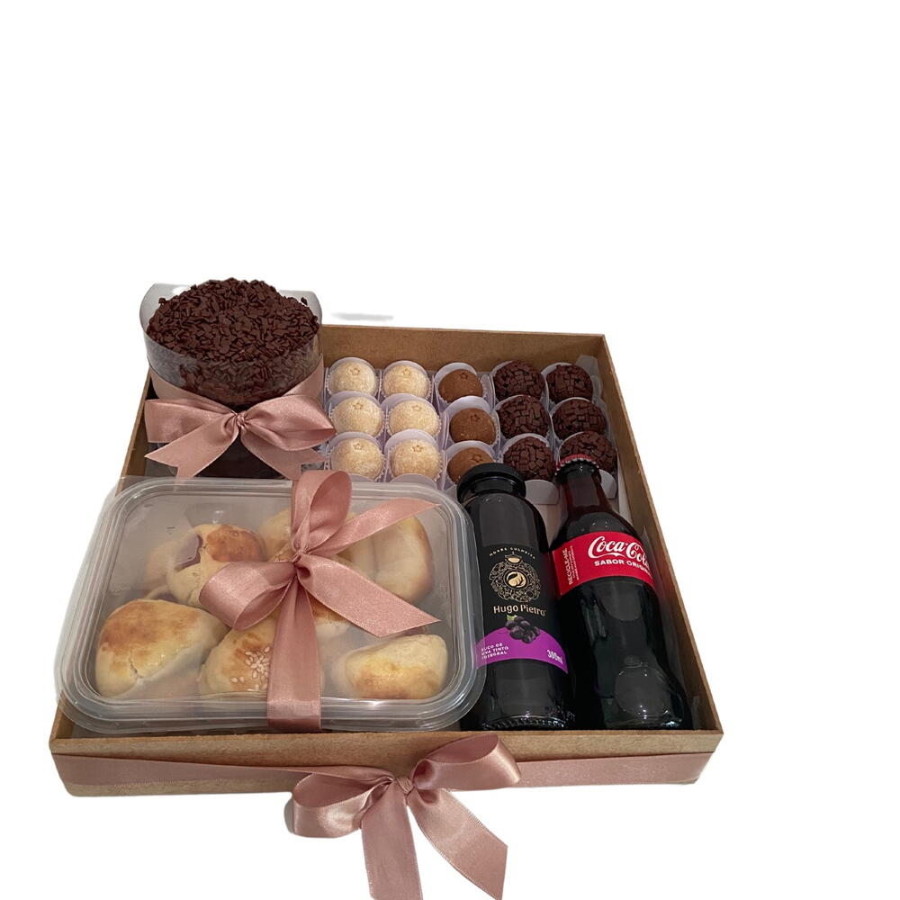 bombons - 3 un. mini bolo - 1 un. docinhos - 15 un. porção de salgadinhos - 1 un. caixa em madeira mdf - 1 un. refrigerantes ou suco - 2 un.