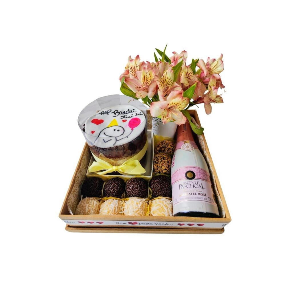 Este é um pacote especial de Presente com Bebida, perfeito para ocasiões comemorativas, festividades ou simplesmente para apreciar um momento relaxante. Contém deliciosos docinhos de festa que derretem na boca, com 8 unidades para você saborear ao máximo. Também acompanha uma unidade irresistível de bento cake, uma delícia culinária feita à mão. A bebida (consulte nossas opções) selecionada para estes mimos será sua refrescante companhia, juntamente com um mini buquê encantador. Isso tudo é entregue numa luxuosa bandeja, enfeitada com palha decorativa para realçar ainda mais seu presente. Este é um verdadeiro deleite dos sentidos!