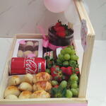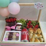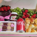 nutella - 1 un. uvas - 30 un. morangos - 10 un. balões - 1 un. bandeja - 1 un. bexigas coloridas - 5 un. coca cola - 1 un. bolo bento cake - 1 un. salgados assados ou fritos - 12 un. brigadeiros variados - 12 un. cartão com msg - 1 un.
