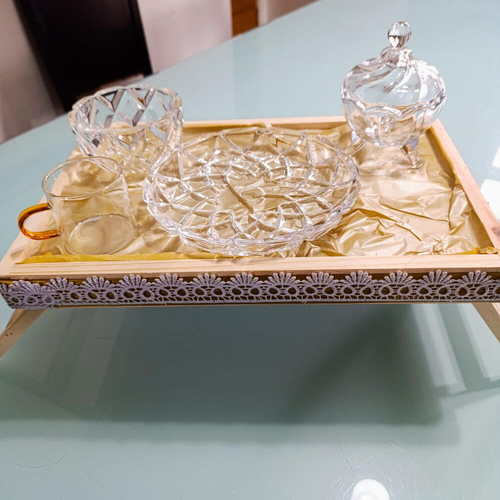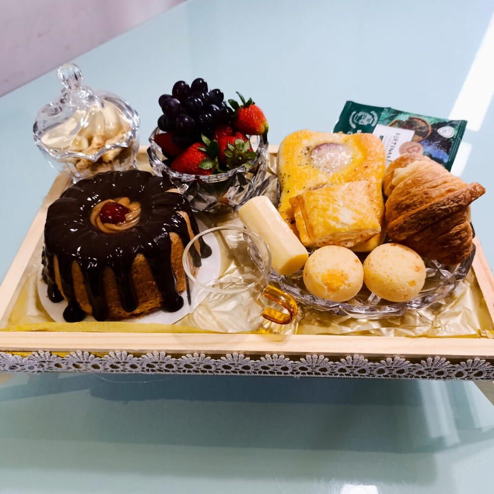 frutas - 1 un. bolo - 1 un. croissants - 1 un. bandeja - 1 un. biscoitos finos - 1 un. café gourmet ou capuccino - 1 un. pães de queijos - 1 un. waflle com nutella - 1 un. peças permanentes em cristal transparente - 4 un.