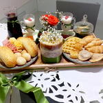 chocolates - 1 un. bolo - 1 un. pão de queijo - 1 un. pães - 1 un. croissants - 1 un. bandeja decorada - 1 un. duas taças ou duas canecas luxuosas - 2 un.