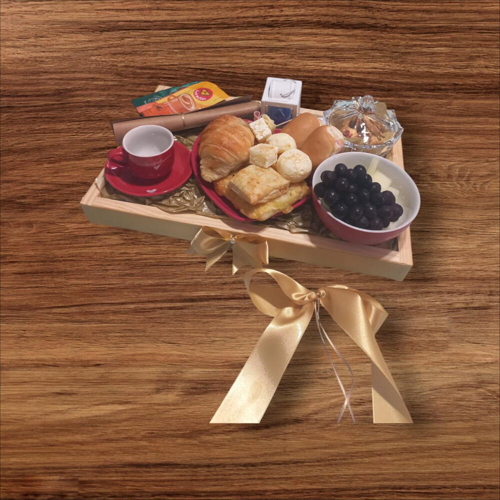 Desfrute de um momento único com esta elegante Cesta de Café da Manhã. A cesta vem recheada de delícias para começar bem o dia. Inclui quatro peças permanentes de porcelana sofisticada, perfeitamente acomodadas numa bandeja requintada. Delicie-se com um croissant fresco e macio, experimente nosso inigualável pão de queijo e saboreie um waflle delicioso acompanhado de nutella. Além disso, a cesta traz uma seleção de frutas frescas e biscoitos finos para complementar a sua refeição. Para a perfeita harmonização, a cesta conta ainda com um café gourmet, conferindo a essa experiência um sabor ainda mais especial. Surpreenda alguém com este presente elegante e delicioso ou desfrute de uma manhã luxuosa a seu favor. Obs: Todas nossas bandejas tem a opção de acompanhar um lindo mini buquê de flores. Vão de carro devido a delicadeza dos produtos e a segurança alimentar. Vai com uma linda dedicatória impressa numa folha de pergaminho e chocolates.