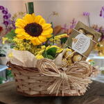 flor de girassol - 1 un. cesta dupla de vime - 1 un. bombom ferrero rocher de 8 unidades - 1 un.