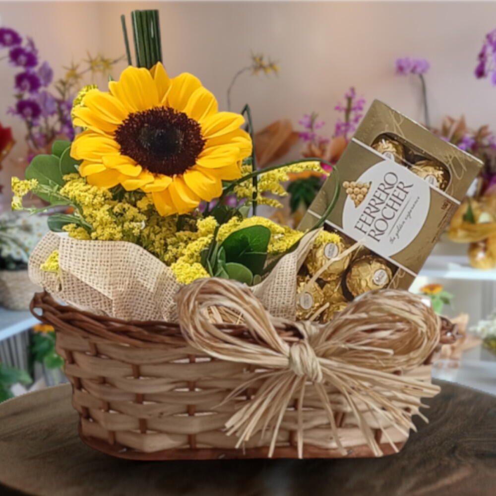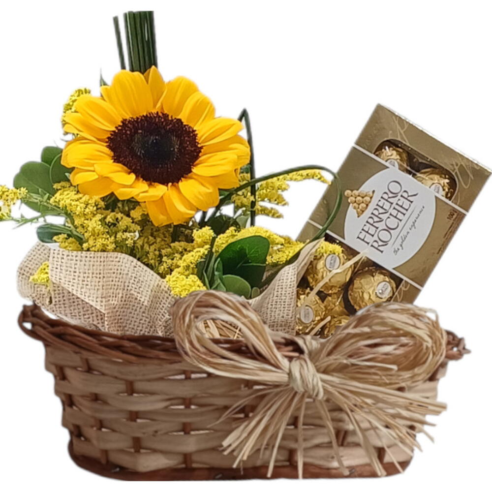 flor de girassol - 1 un. cesta dupla de vime - 1 un. bombom ferrero rocher de 8 unidades - 1 un.