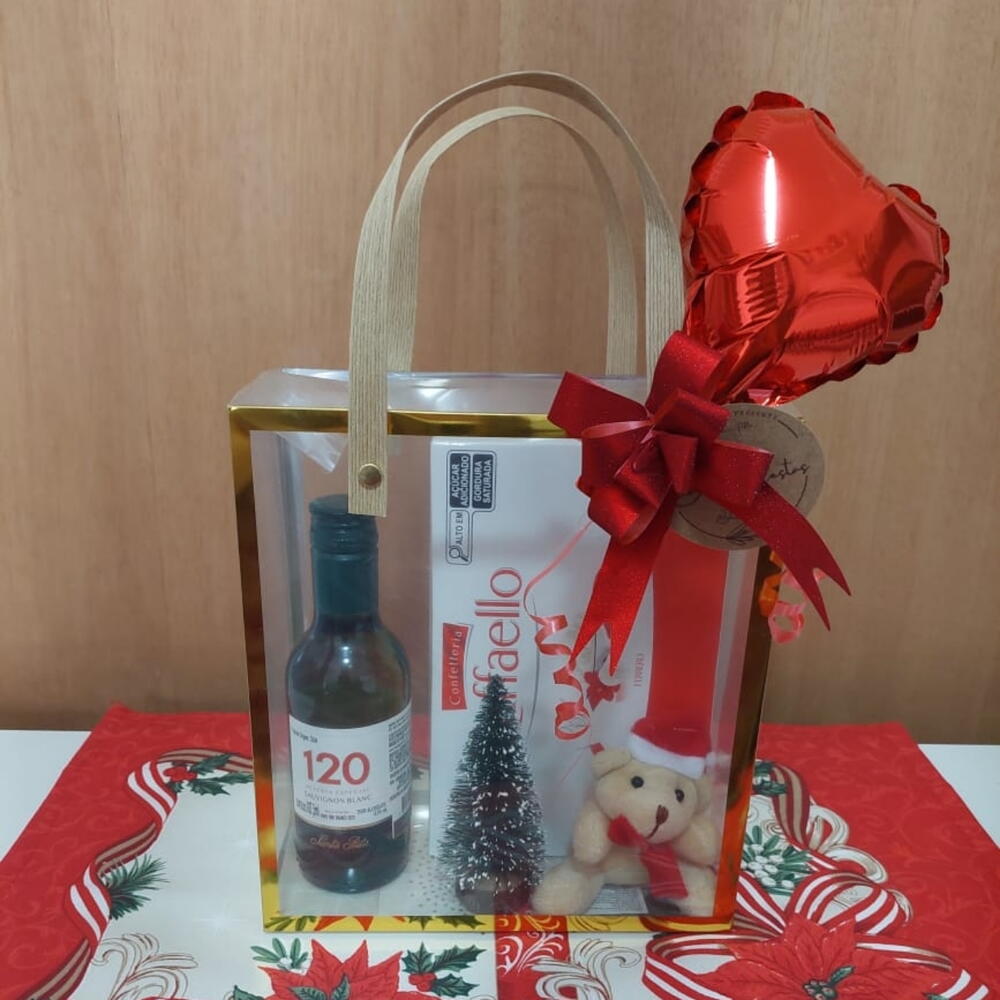 caixa rafaello - 1 un. laço decorativo com tag personalizada - 1 un. bag transparente acetato - 1 un. mini balao em formato de coração - 1 un. mini árvore decorativa - 1 un. pelucia chaveiro de natal - 1 un. vinho 120 reserva especial 187 ml - 1 un.