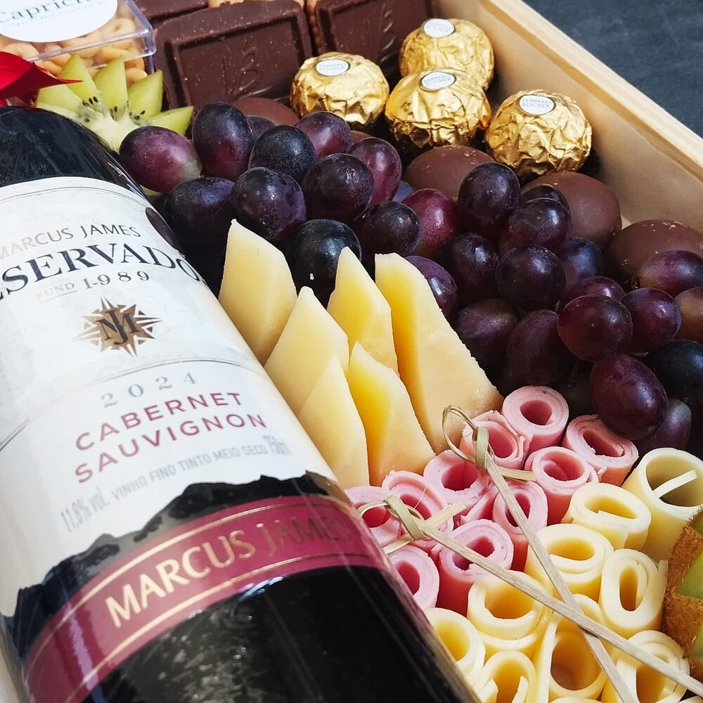 kiwi - 1 un. bombom ferrero rocher - 4 un. queijo provolone - 80 gr. mix de castanhas - 50 gr. presunto fatiado - 2 un. sonho de valsa 20g - 5 un. saco transparente - 1 un. queijo mussarela fatiado - 2 un. pingo de ouro - 50 gr. vinho reservado (cabernet sauvignonmerlot) 750ml - 1 un. biscoito balducco - 6 un. laço personalizado - 1 un. uva 150g - 150 gr. bandeja de pinos - 1 un.