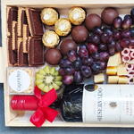 Descubra uma deliciosa seleção de sabores com nossa Tábua de Frios irresistível. Experimente o sabor exótico do Kiwi (1 un), acompanhado pela indulgência dos bombons Ferrero Rocher (4 un). Aprecie o queijo Provolone (80g) e mistura de castanhas (50g), perfeitamente complementados por fatias de presunto (2 un). Deixe-se seduzir pelos doces Sonho de Valsa (5 un de 20g cada) e biscoito Balducco (6 un), proporcionando uma experiência de sabor verdadeiramente única. A bandeja ainda conta com queijo mussarela fatiado (2 un) e os salgadinhos Pingo de Ouro (50g). Para completar, acompanha vinho reservado (Cabernet Sauvignon Merlot - 750ml), frutas frescas na medida certa (uvas - 150g) e embalagem com laço personalizado. Tudo isso servido em uma bandeja de pinos (1 un) e embalado em saco transparente (1 un), oferecendo requinte e elegância para qualquer ocasião. Experimente e surpreenda-se!