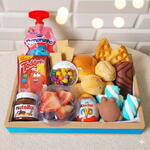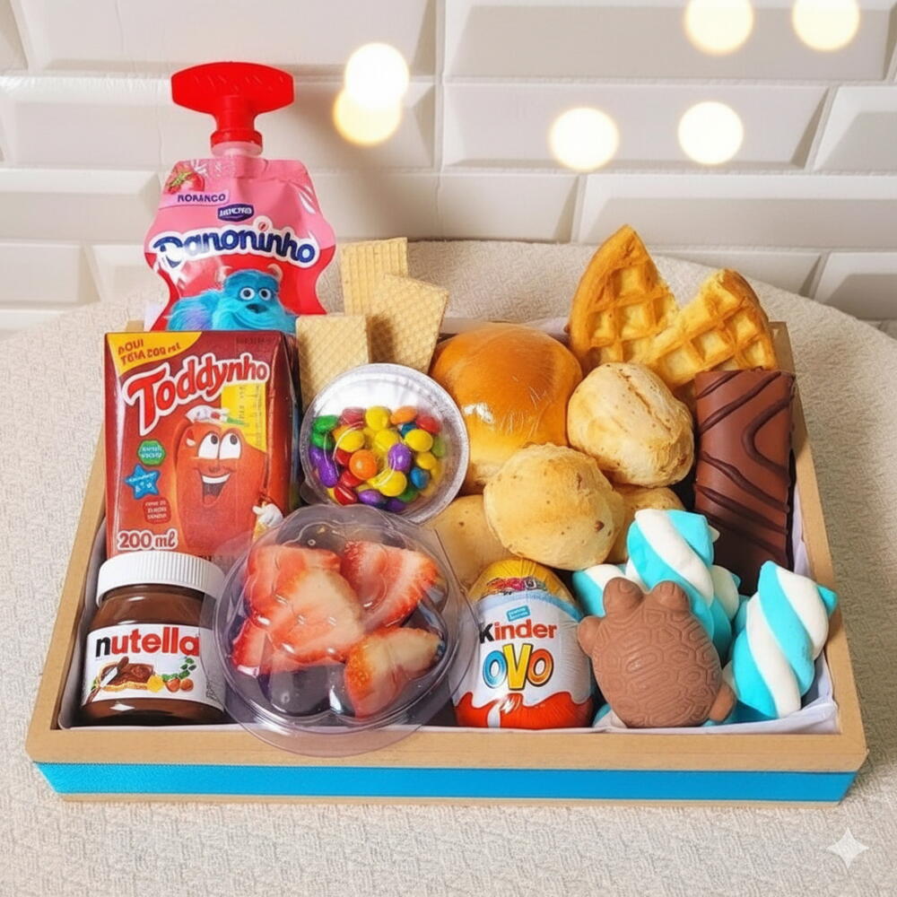 waffer - 1 un. pão de queijo - 4 un. pão brioche - 1 un. tortuguita - 1 un. nutella 140 gr - 1 un. toddinho - 1 un. porção de marshmallow - 1 un. confete - 1 un. caixa de mdf decorada com fita (azul.ou rosa) - 1 un. 1 kinder ovo - 1 un. bolinho roll da baduco - 1 un. porção de uva sem semente - 1 un. danoninho saquinho - 1 un. porção de waffer - 1 un.