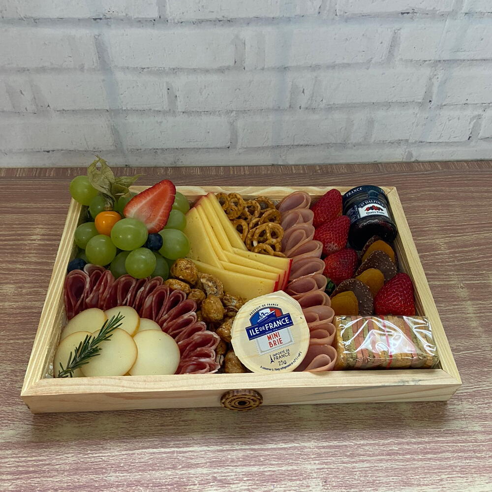 chocolate - 1 un. salame - 1 un. queijo parmesão - 1 un. torrada - 1 un. uvas - 1 un. morangos - 1 un. damasco - 1 un. geléia - 1 un. laranja desidratada - 1 un. lombo canadense - 1 un. queijo provolone - 1 un. castanhas - 1 un. caixa em madeira pinus 30x20 - 1 un. queijo brie ou brie francês conforme a disponibilidade do dia - 1 un.