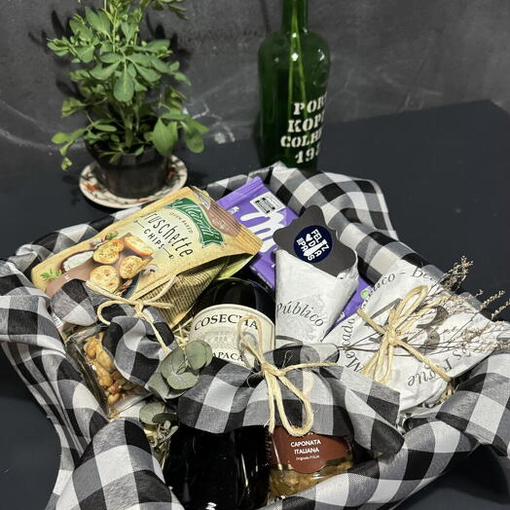 box - 1 un. cesta - 1 un. laço - 1 un. salame fatiado - 1 un. caponata - 1 un. queijo brie - 1 un. queijo gouda - 1 un. embalagem celofane - 1 un. chocolate milka - 1 un. castanhas de caju - 1 un. folhagens decorativas - 1 un. tecido decorativo - 1 un. vinho cosecha tarapaca - 1 un. crûtons crocante - 1 un.