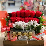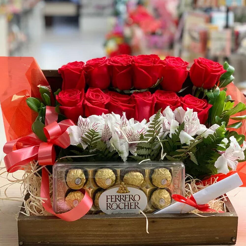 rosa - 12 un. folhagens - 1 un. ferrero rocher - 8 un. laço - 1 un. palha decorativa - 1 un. caixa em madeira - 1 un. baú de mdf rustico - 1 un.