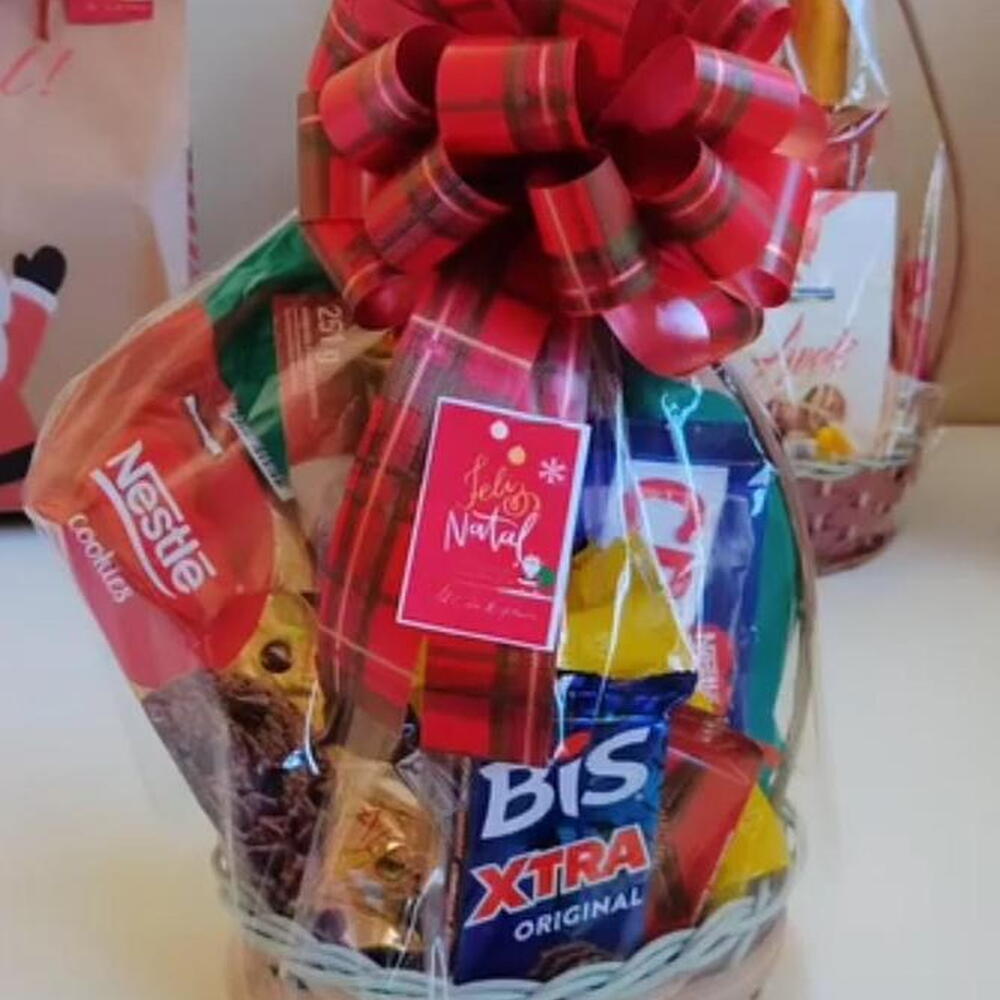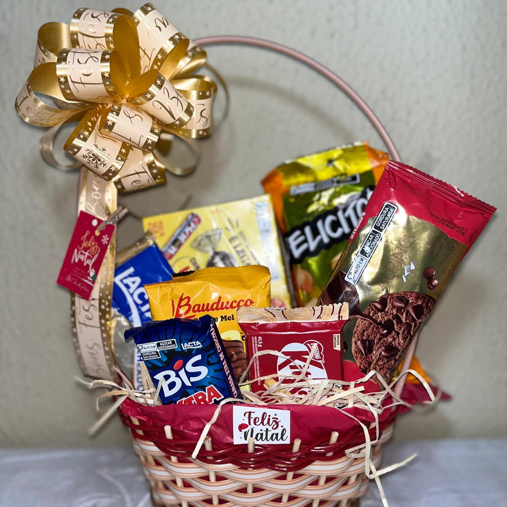 caixa de chocolate - 1 un. kit kat - 1 un. pão de mel - 1 un. cookies - 1 un. bis extra - 1 un. cesta de palha - 1 un. barra de chocolate ou suco de uva - 1 un. embalagemdecoração - 1 un.