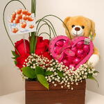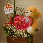 caixa de madeira - palhas - 1 un. urso pelúcia 1520 cm - 1 un. arranjo rosa vermelhas - folhagens verdes - gypsophila - juncos - 8 un. coração bombonatti no.1 - chocolate ai leite - 1 un.