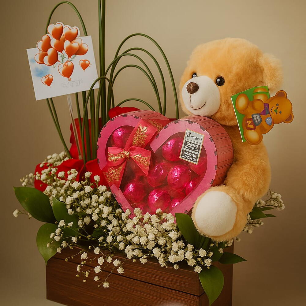 caixa de madeira - palhas - 1 un. urso pelúcia 1520 cm - 1 un. arranjo rosa vermelhas - folhagens verdes - gypsophila - juncos - 8 un. coração bombonatti no.1 - chocolate ai leite - 1 un.