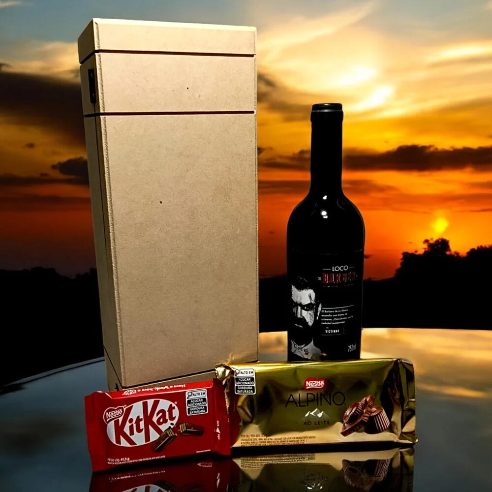 celofane e laço - 1 un. vinho fino tinto meio seco espanhol loco barber uva barbera 750 ml - 1 un. caixa baú mdf - 1 un. chocolate kit kat 41 g - 1 un. chocolate alpino ao leite 85 g nestle - 1 un.
