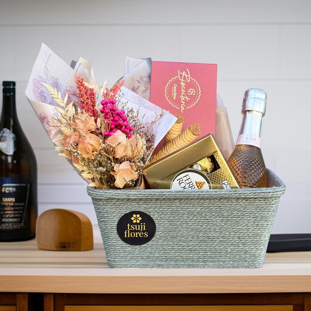 Este presente encantador contém um mini arranjo de flores desidratadas elegantemente envolvido em celofane transparente com um laço de cetim, complementado por uma charmosa jardineira de papel. Para saciar os sabores, temos um exclusivo mini espumante rosé Freixenet de 200ml que harmoniza perfeitamente com um delicioso Ferrero Rocher de 50gr. Incluso também, um irresistível wafer de cacau da Cacau Show. Tudo isso lindamente apresentado numa cesta de presente.