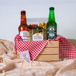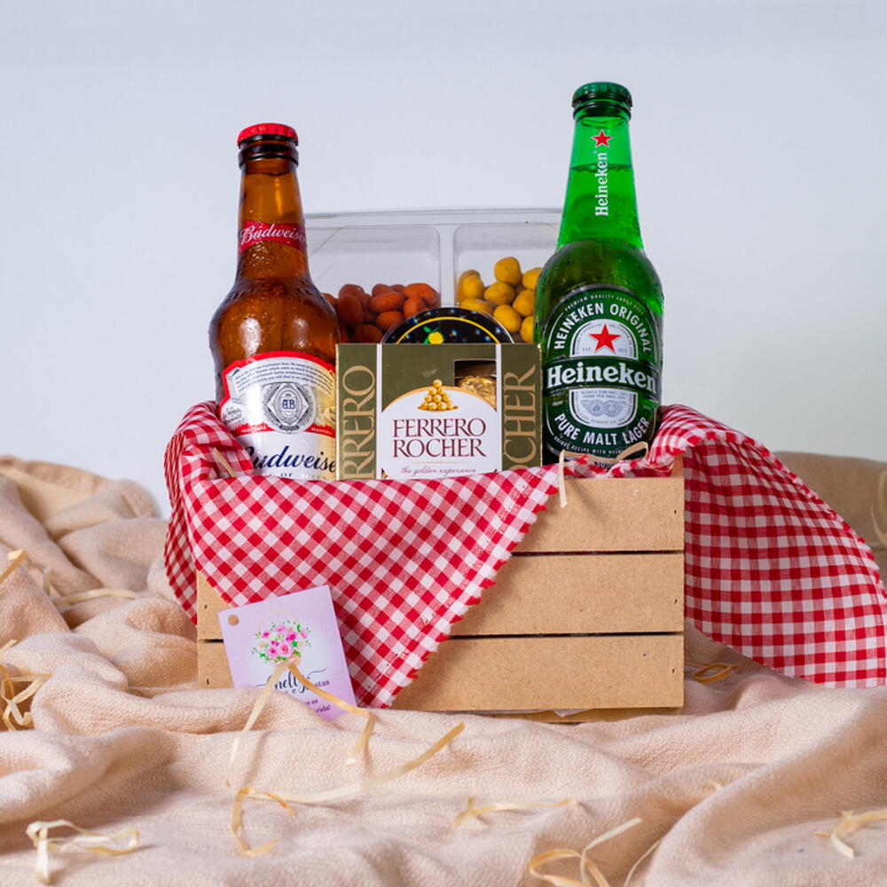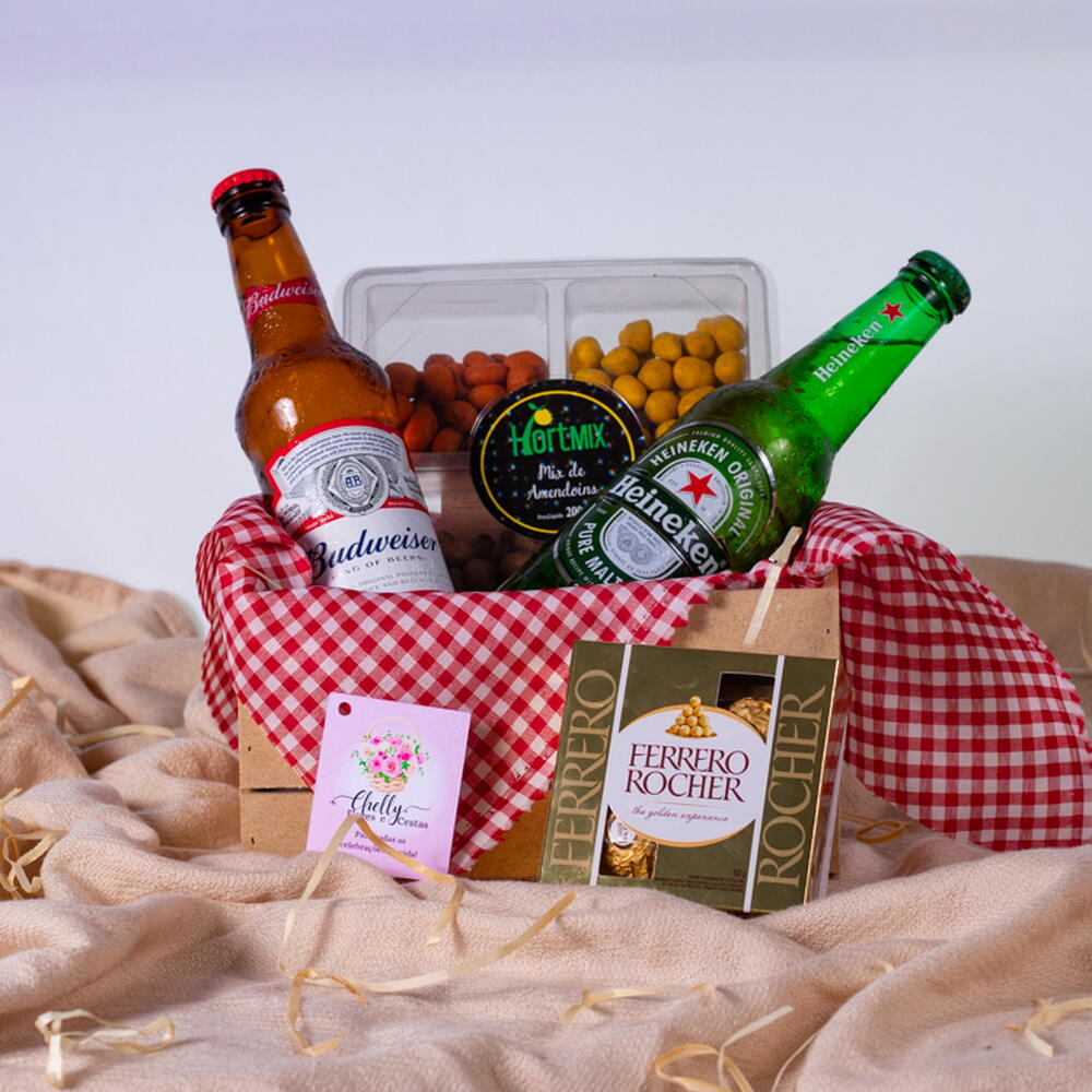 embalagem para presente - 1 un. caixote mdf - 1 un. cerveja long neck - 2 un. roleta mix de amendoins - 1 un. chocolate ferrero rocher t4 - 1 un.