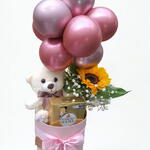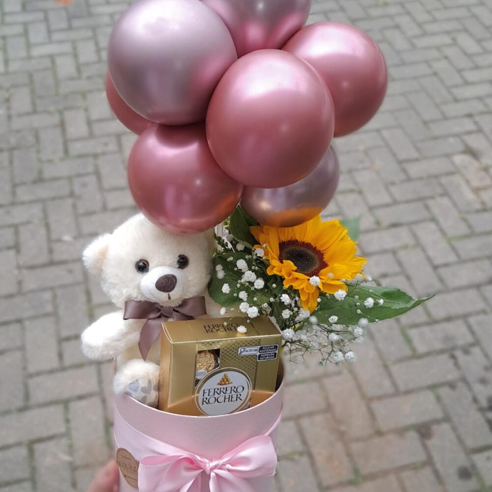 pelúcia - 1 un. caixa decorada - 1 un. ferrero rocher 4 unidades - 1 un. arranjo de balões - 1 un. girassol para presente - 1 un.