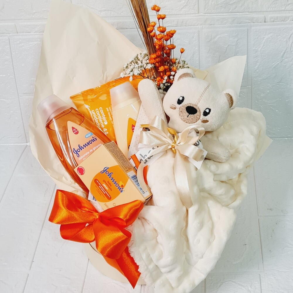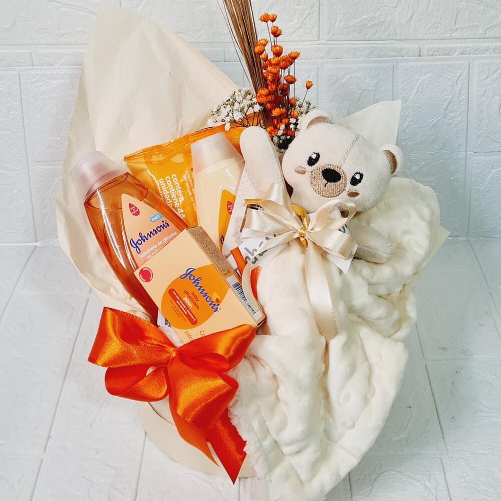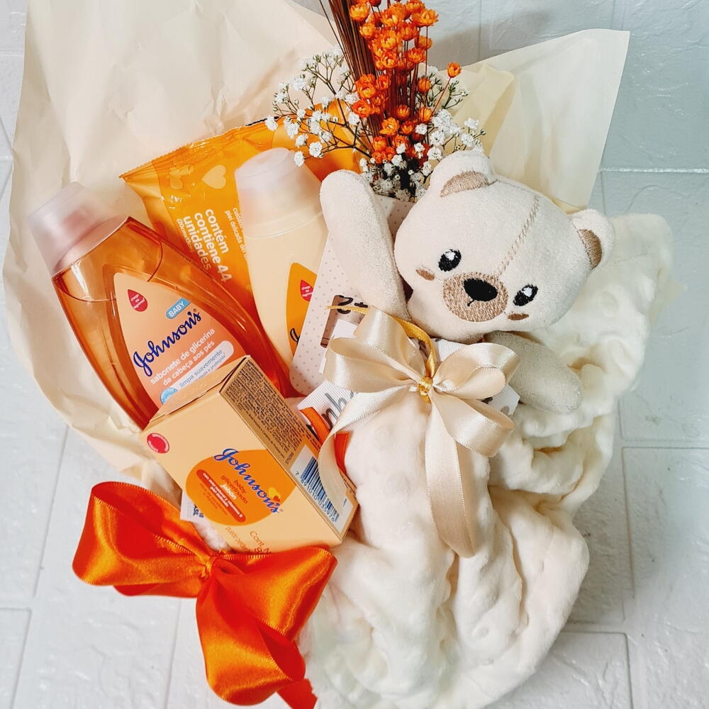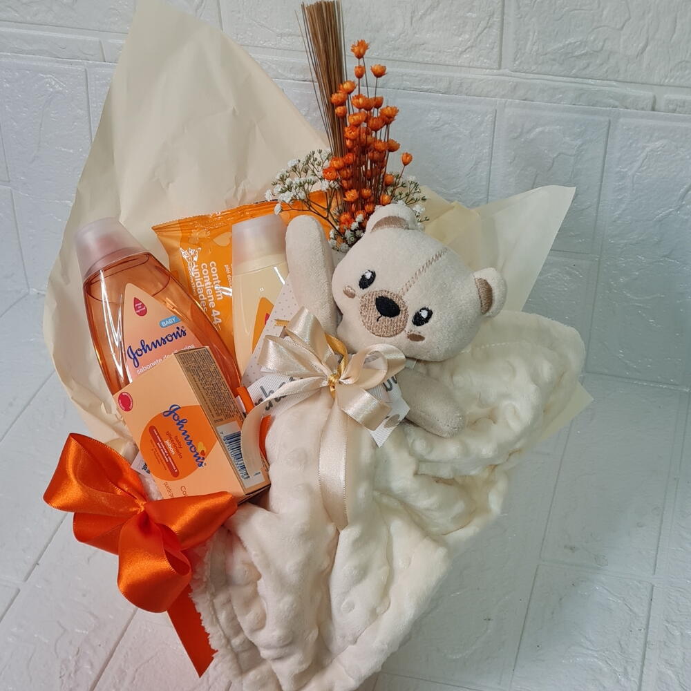 shampoo - 1 un. lenço umedecido - 1 un. condicionador granado bebê - 1 un. nadinha creme - 1 un. barra sabonete johnson - 1 un. 1 raminho de flores desidratadas - 1 un.