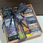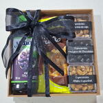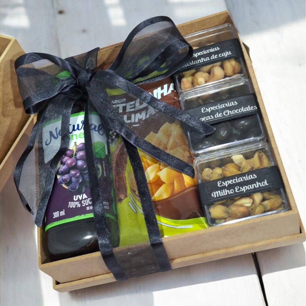 caixa acrílica com amendoim e chocolate - 1 un. caixa mdf personalizada com um laço preto elegante. - 1 un. suco de uva natural one de300 ml - 1 un. caixa acrílica com mix de milho espanhol (mostarda e mel) - 1 un. caixa acrílica com castanha de caju - 1 un. biscoito aperitivo torcida - 1 un.